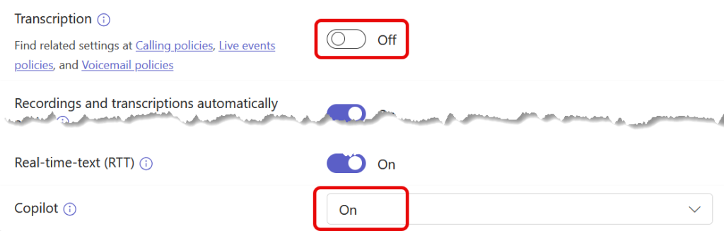 The policy also has the generic “Transcript” setting and that matters here as well. If the generic Transcript is enabled, users can record the text of the meeting in a transcript and use it for Copilot or other AI after the meeting.