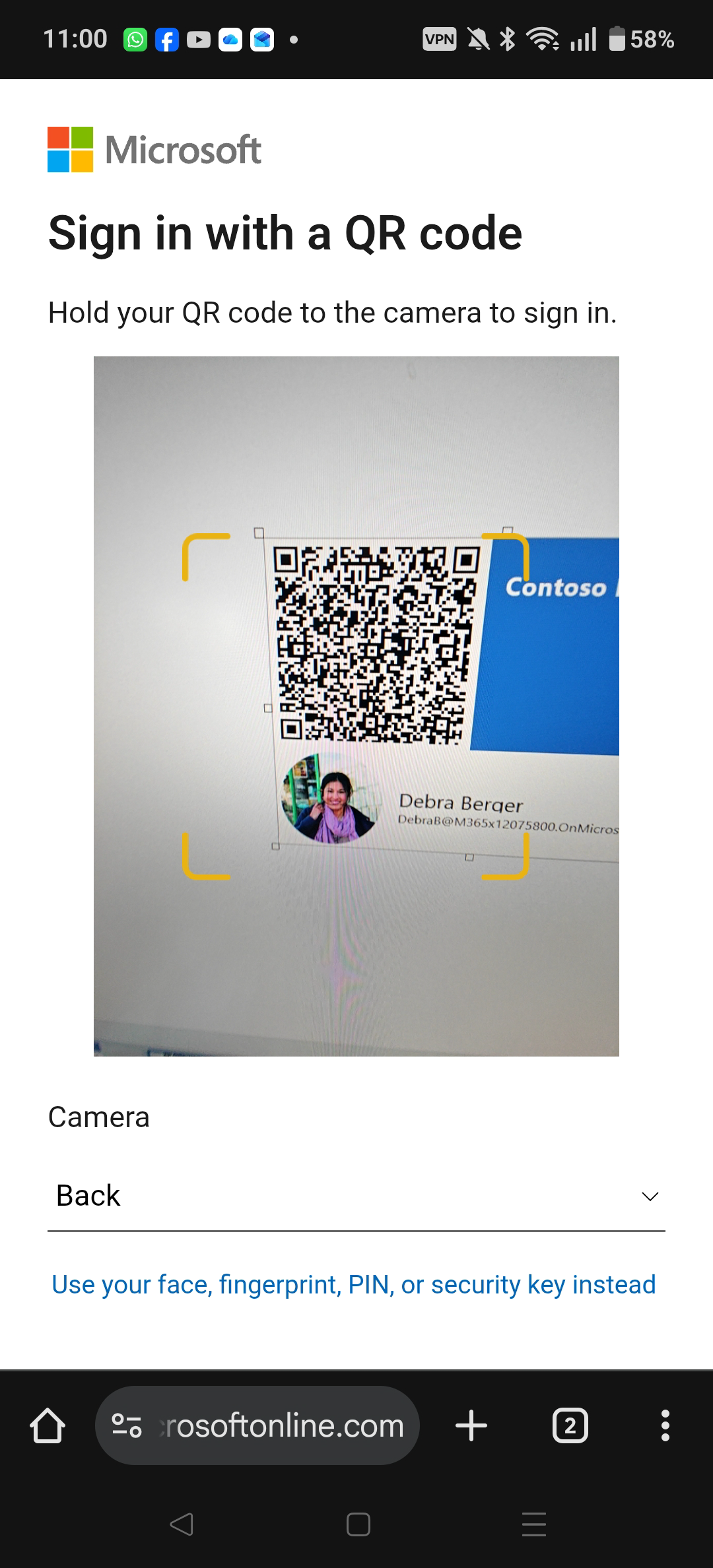 Once you select Sign in with a QR code you may see a camera consent prompt. This can be removed with MSAL code in the application, but once you allow the use of the camera you can scan your QR code, for example on the ID badge as shown below: