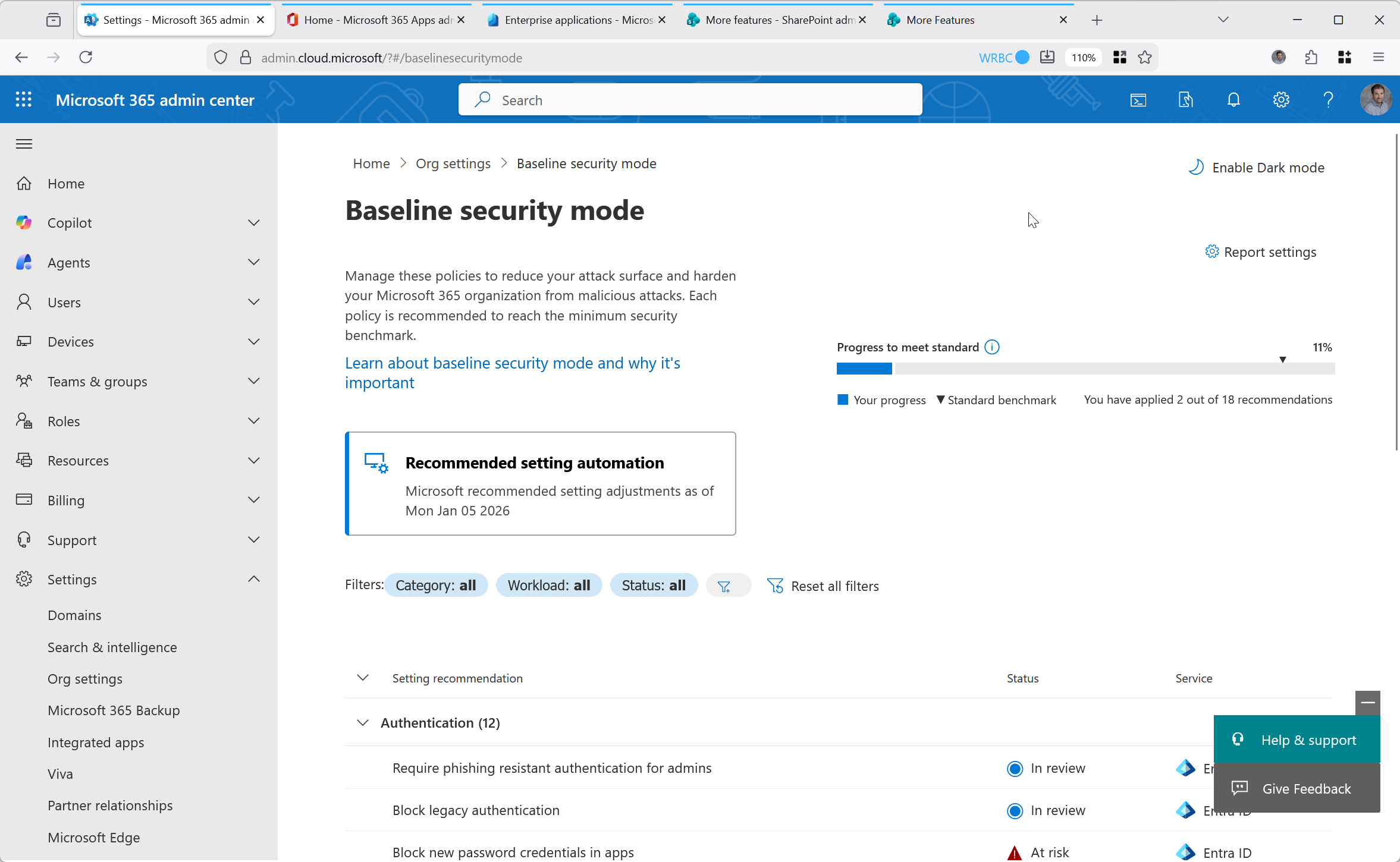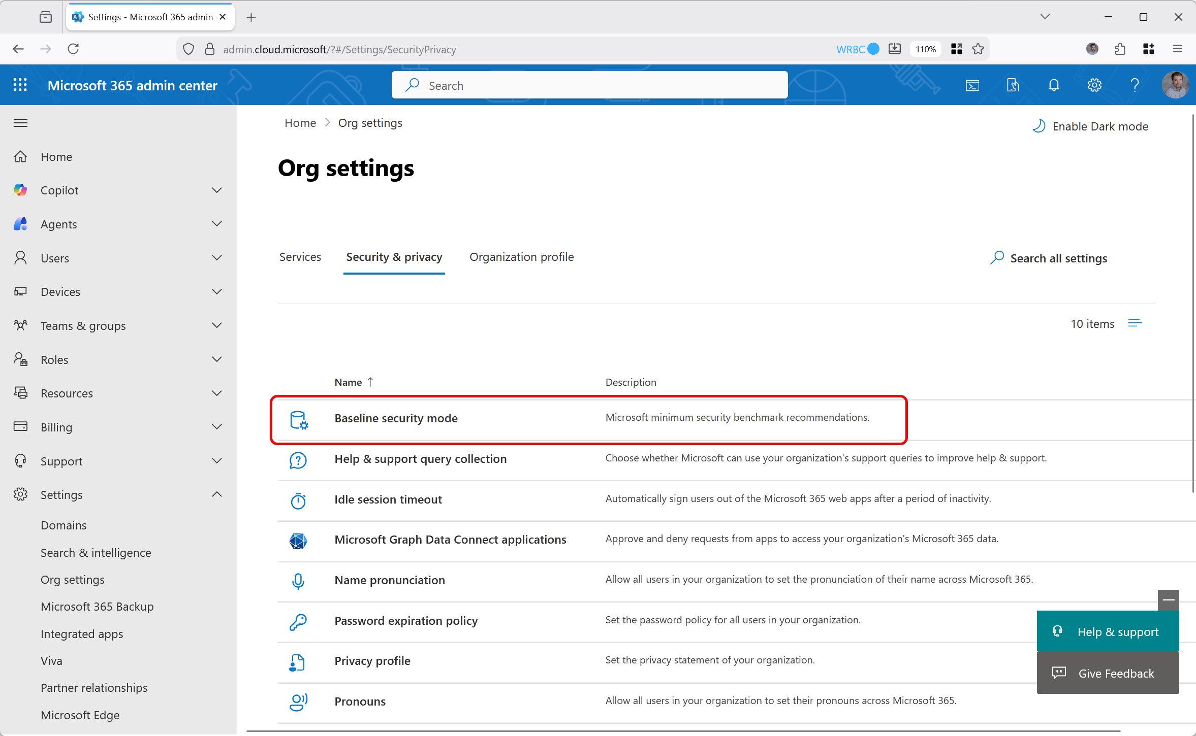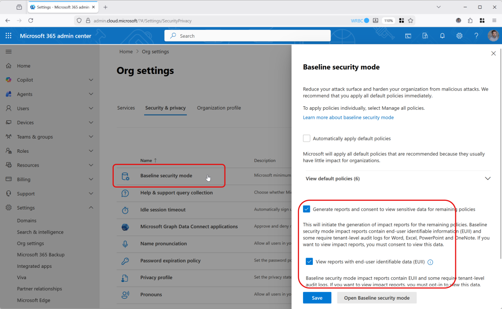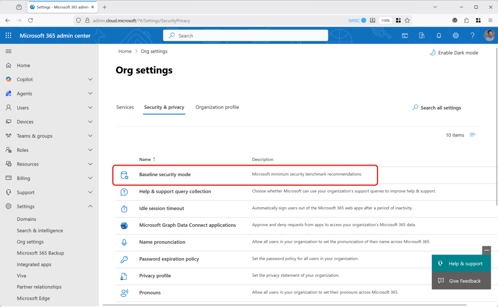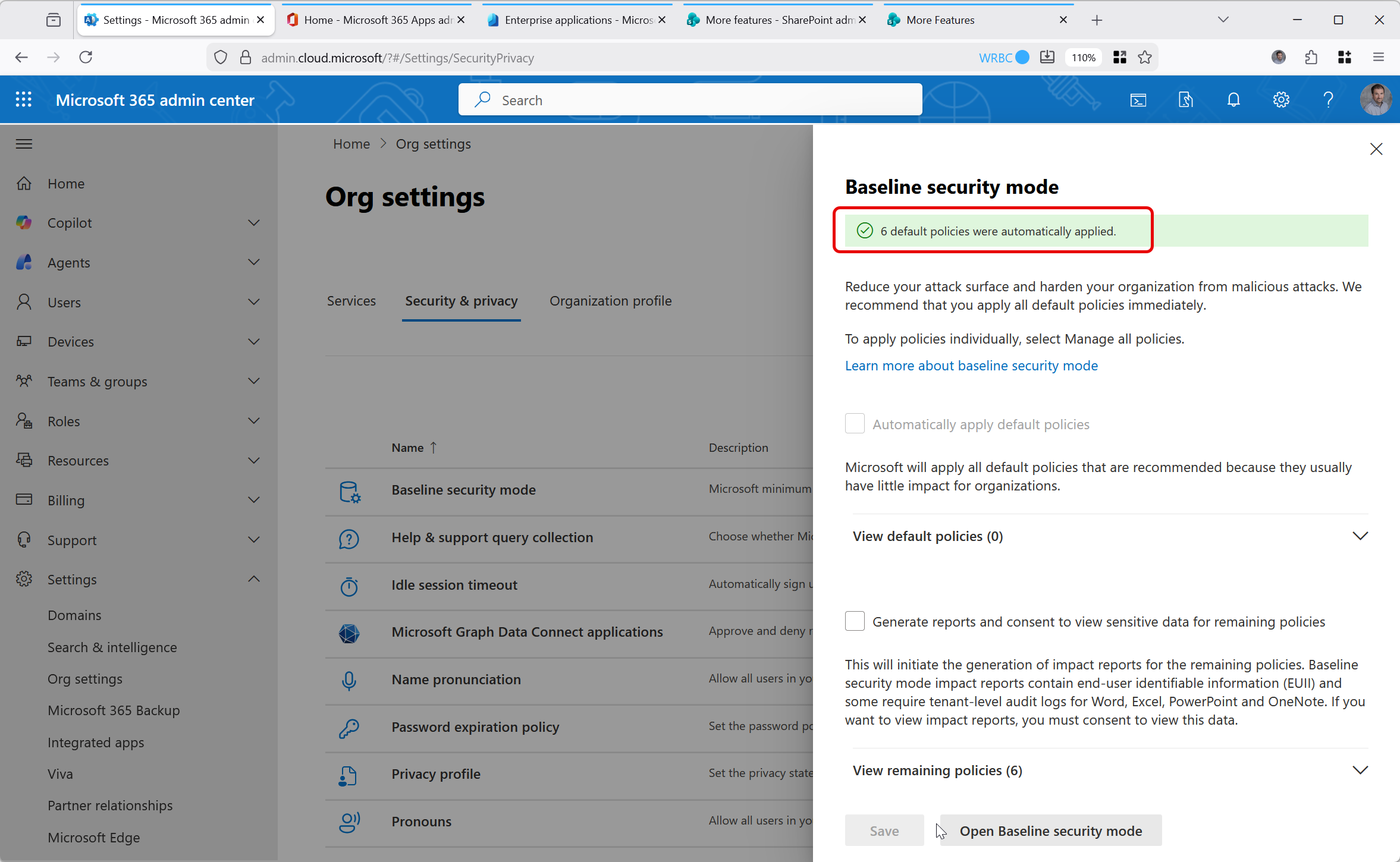 Well this is about to change with Microsoft 365 Baseline Security Mode. This is reachable via the M365 Admin Center > Settings > Org Settings > Security & Privacy and then Baseline Security Mode: