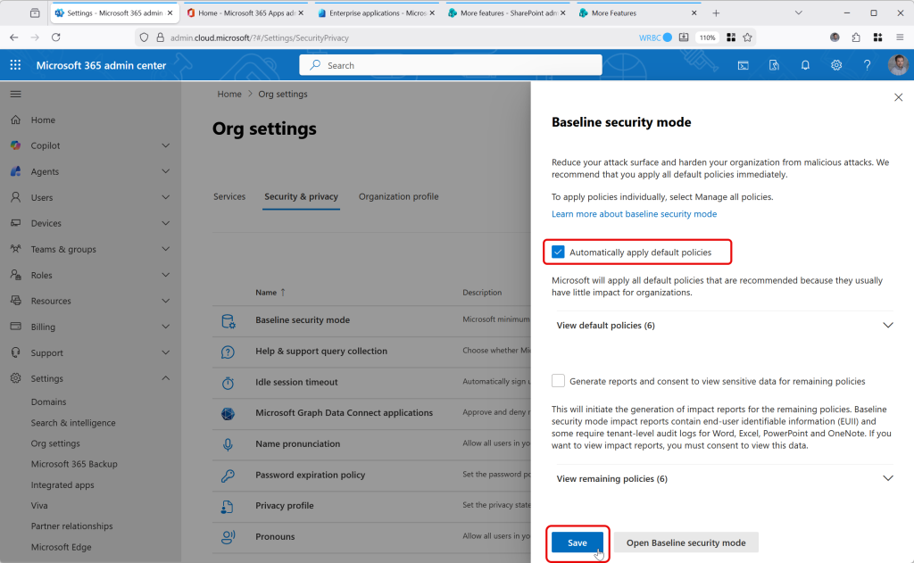 Turning on these default policies will make changes for you in Entra ID > Enterprise Apps > Consent, SharePoint Admin Center > More Features > Apps and will add some settings to the newly created “Policies for all users” M365 Apps cloud policy.