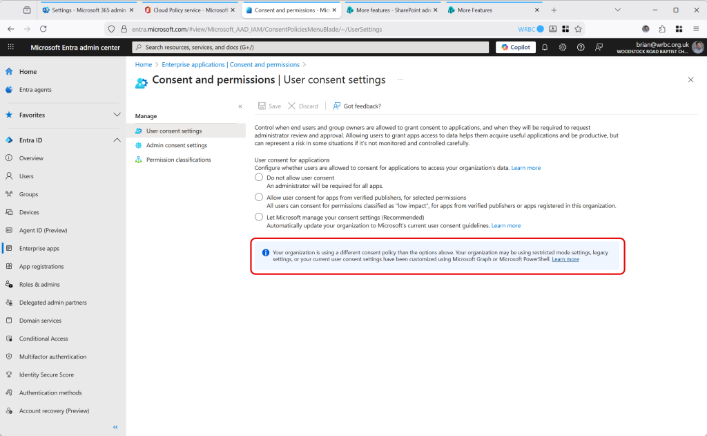 For the “restricted management user consent settings”, these can be seen via Graph or PowerShell, because if you look in Entra ID > Enterprise Apps > Consent and permissions you will see this: