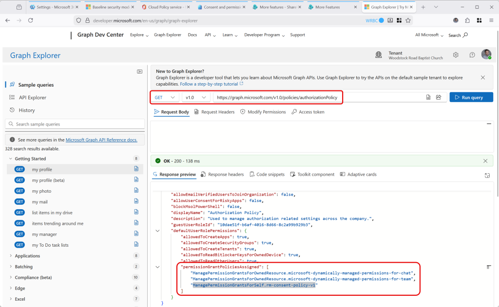 To see this policy you need to use PowerShell or Graph. In the following screenshot we have opened Graph Explorer (https://aka.ms/ge) and viewed the tenant authorizationPolicy (GET https://graph.microsoft.com/v1.0/policies/authorizationPolicy). This returns a response that contains permissionGrantPoliciesAssigned = “ManagePermissionGrantsForSelf.rm-consent-policy-v1” (and other values). This is an internal Microsoft permission policy setting, and so it is not visible for representation in the above Consent and Permissions page!