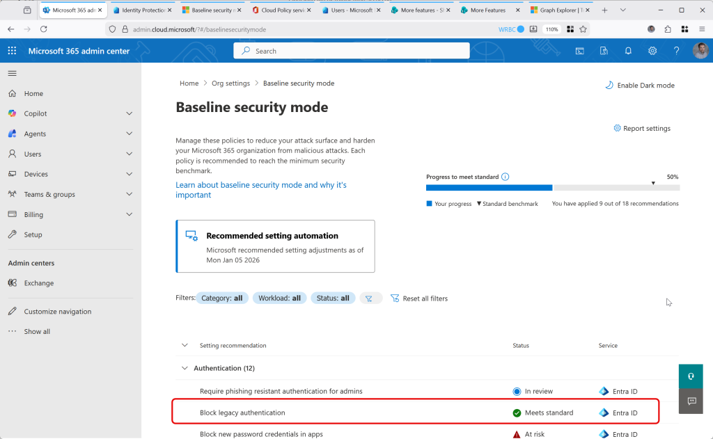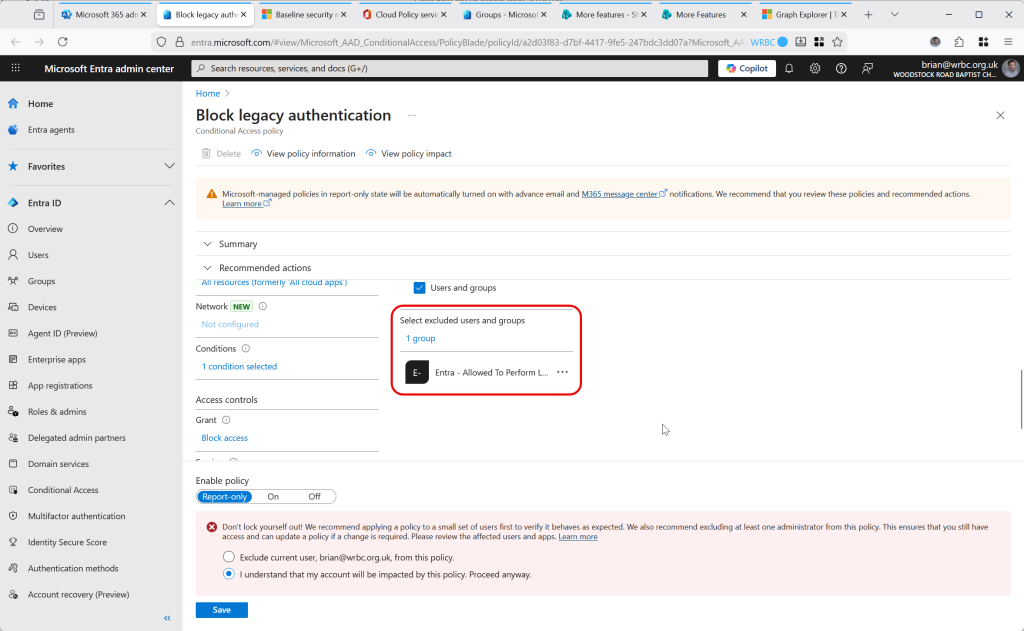 For example, you should have next to no legacy authentication happening in Entra ID anymore. The current exceptions will be SMTP based authentication and that is disabled in October 2026 anyway. So you would use the reporting, determine who in the previous days since you enabled the reporting is doing legacy authentication and then enable the policy with these users/groups being exempt from the policy. For example, running the baseline reports shows that there is one user doing SMTP Authentication, so we create a group called “Entra – Allowed To Perform Legacy Authentication” and add this user to the group, and then exempt this group in the baseline policy: