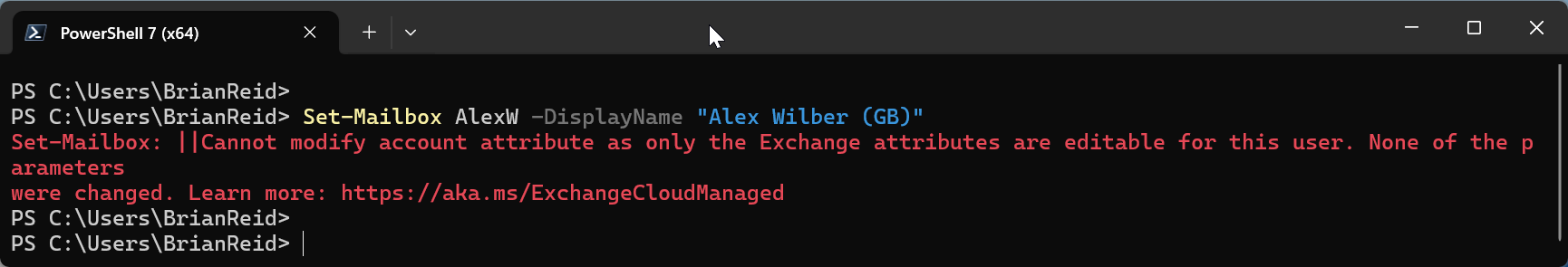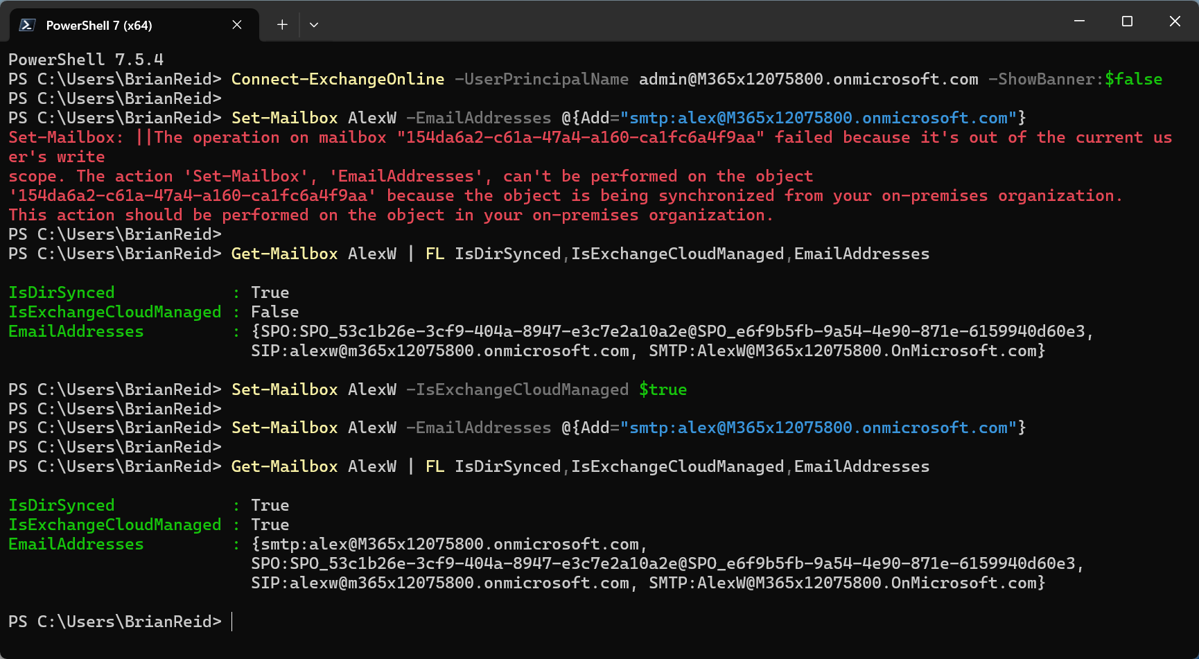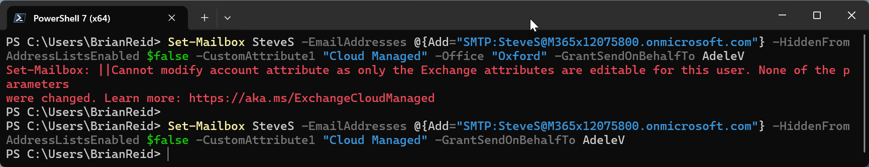 We can see that the second attempt to update the email address directly in Exchange Online succeeded, whereas the first failed.