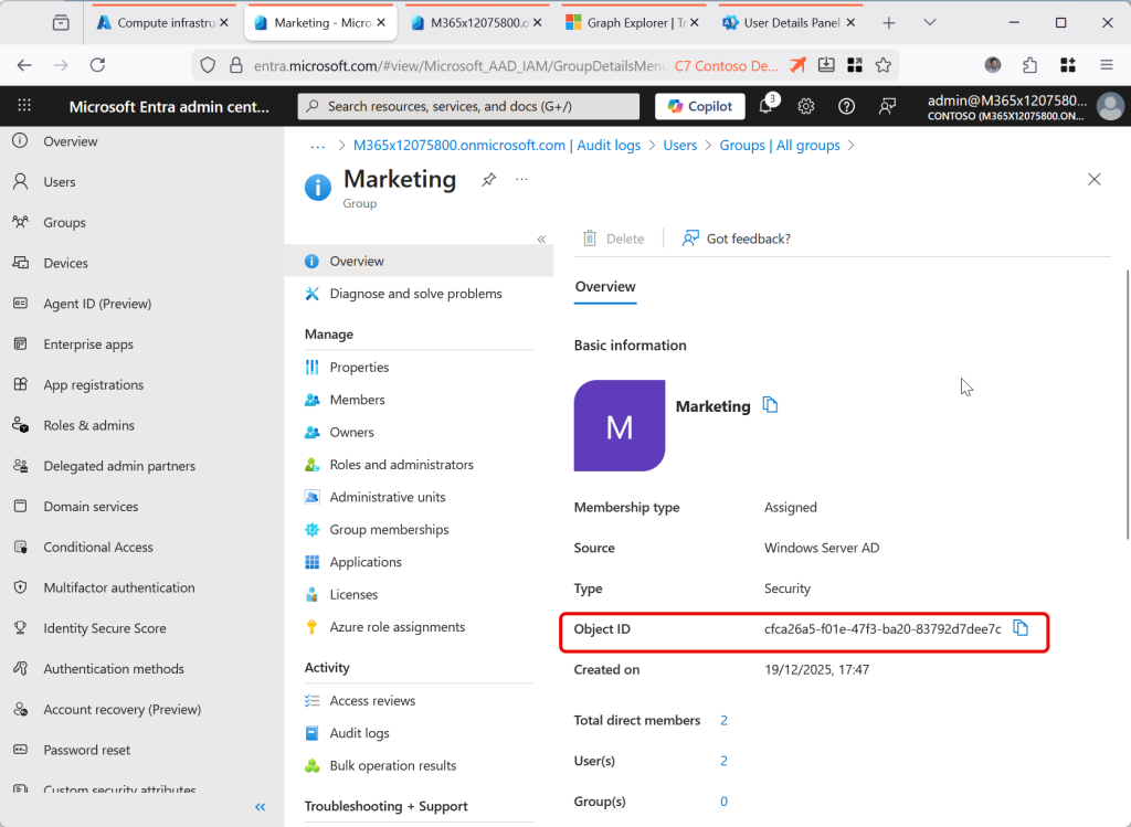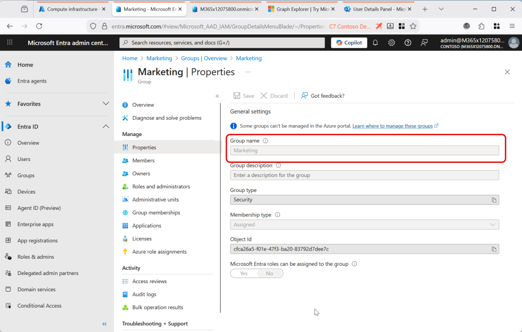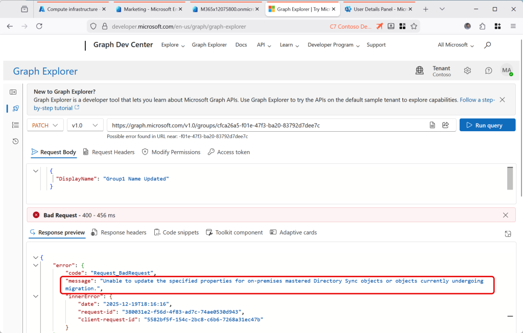 Check your permissions if you cannot modify the object in Graph Explorer – even if you have the correct roles to modify it via the Entra portal, you need the permission Group.ReadWrite.All (at least) to change the group via Graph. You will get a different error from the above if you lack the permissions vs the group being AD managed and therefore not manageable in the cloud.