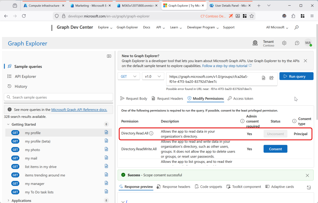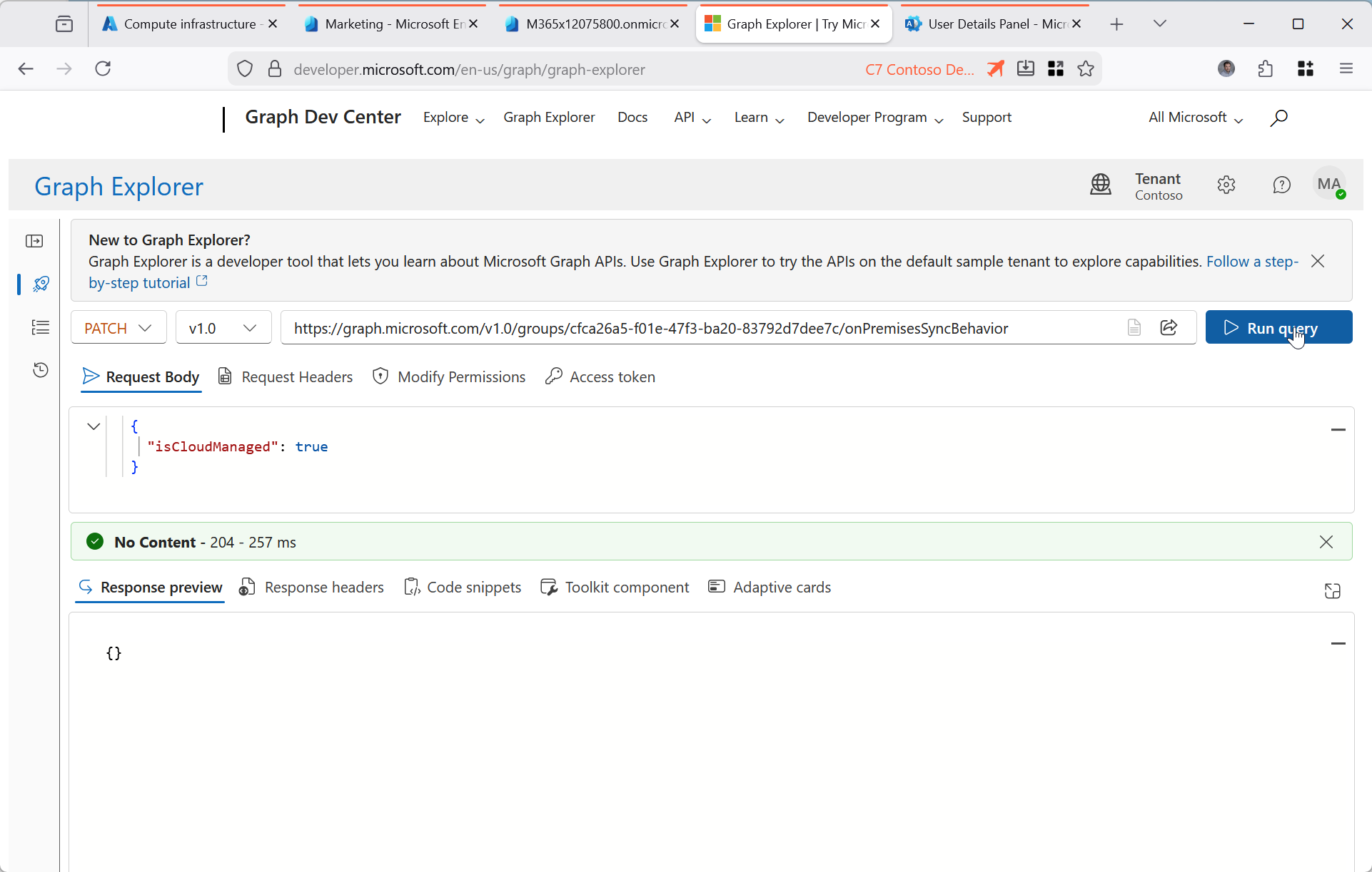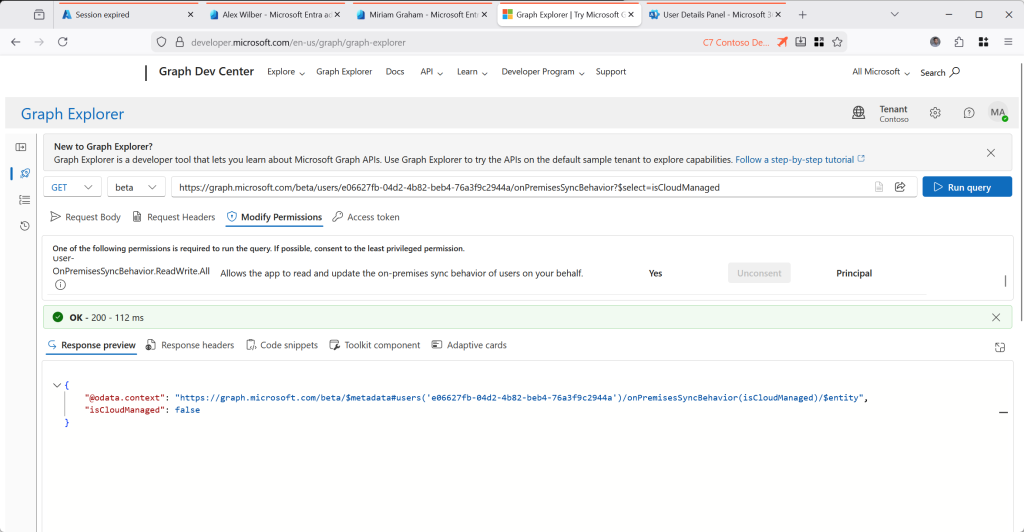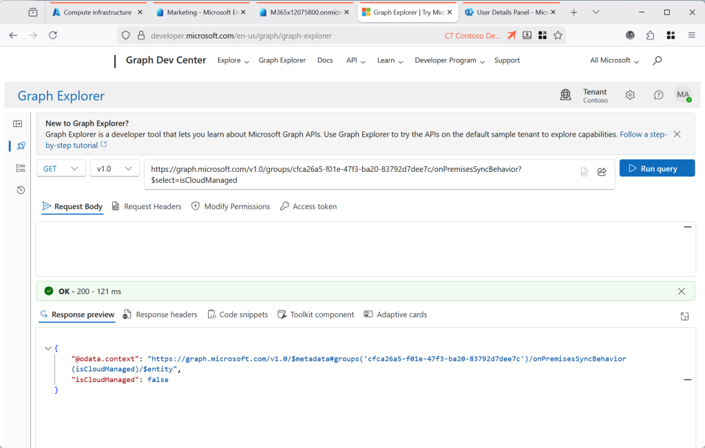 If you try this in the Graph Explorer (where all these screenshots are done) [https://aka.ms/ge] and you get a 403, Forbidden error, change to the Modify Permissions tab and consent to the “Group-OnPremisesSyncBehavior.ReadWrite.All” permission. This lets you both read and write the IsCloudManaged attribute for all groups. If that still does not work, remove “/onPremisesSyncBehavior?$select=isCloudManaged” from the query and check you can read the group in Graph Explorer as shown: