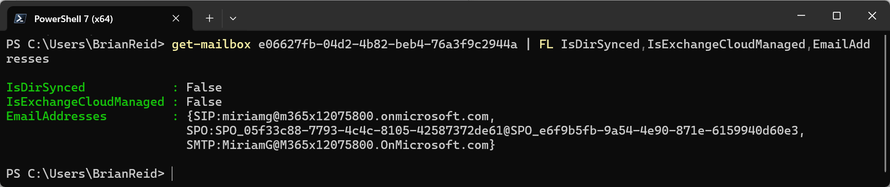 Get-Mailbox AlexW | FL IsDirSynced,IsExchangeCloudManaged,EmailAddresses
