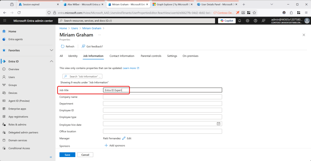 Lets take a look at the last user, MiriamG. This is the one that we have set IsCloudManaged, and so now I can edit this user in the cloud portals (Entra ID portal shown below), and because IsCloudManaged includes the attributes that IsExchangeCloudManaged controls, I can also change Exchange attributes as well:
