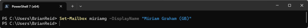 Set-Mailbox AlexW -DisplayName "Alex Wilber (GB)"