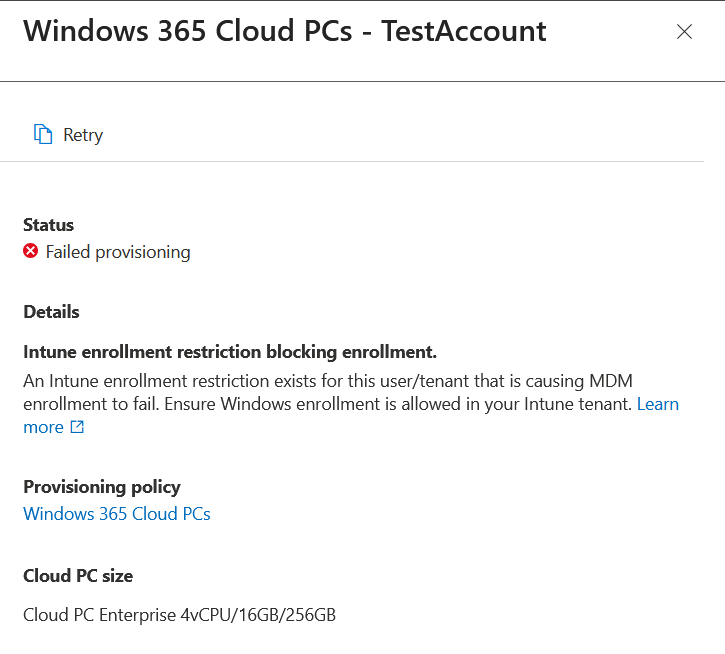 I came across one such issue in the last few days with provisioning. Windows 365 Provisioning said that an enrollment restriction exists for this user/tenant. The problem with this error is that its not detailed enough, becuase Windows enrollment is allowed in the tenant, its just that there are enrollment rules and the documentation does not fully describe exactly who the machine is enrolling as and whether or not its “corporate” or “personal” at the time it enrols, and you can have rules that restrict any of these.