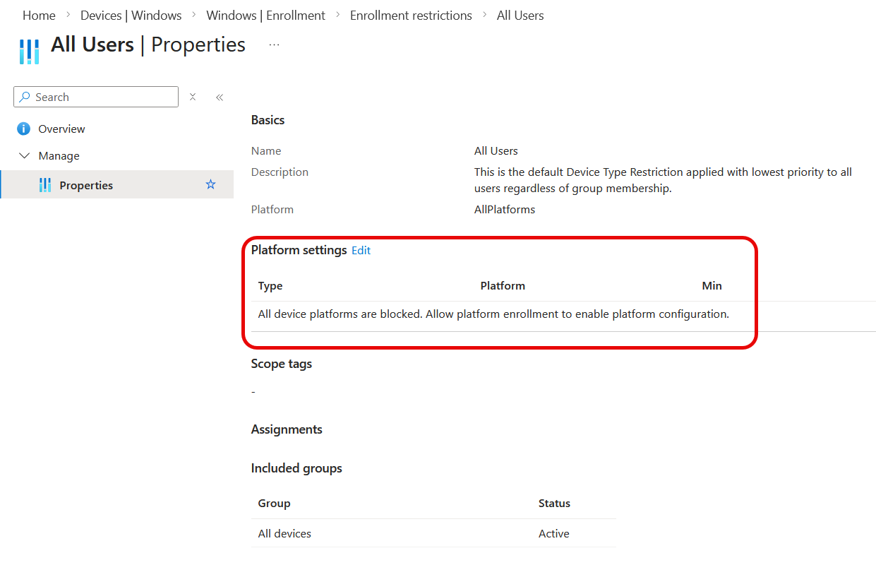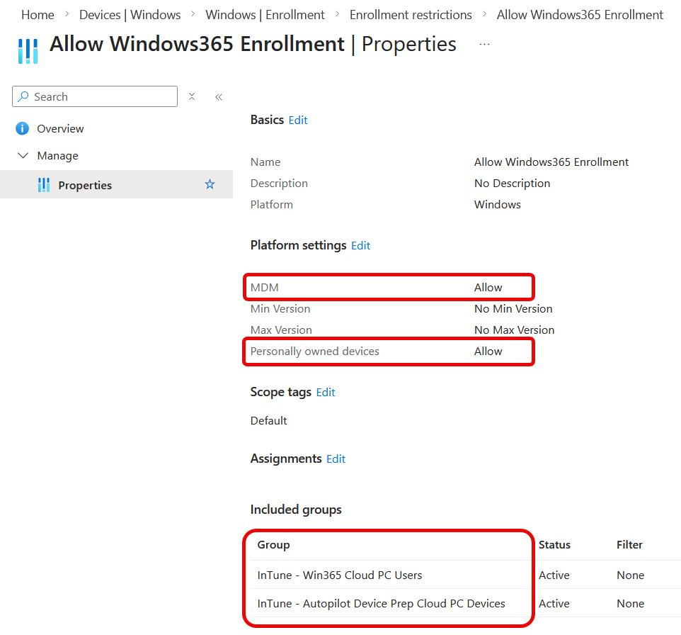 The two groups that I have assigned to this policy are the afore mentioned user group that contains the users with Windows 365 licences and the second group are those that Autopilot Device Preparation policies will place a device into. So in theory both the user and the device that is being provisioned are allowed to enrol corporate or personal devices – but as we see from the earlier status, this failed.