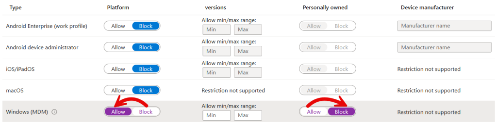 Allow Windows corporate devices, but that turns on Windows personal devices, so turn these off