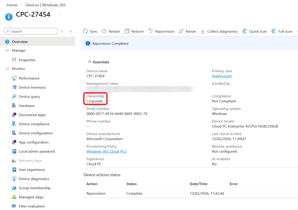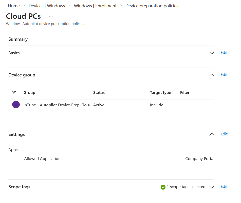 As reprovisioning a Windows 365 Cloud PC is easy (and then wait 30 minutes) I will also attempt a few other changes and see where I get to. I want to see if Autopilot Device Provisioning lets me avoid allowing “Windows (MDM)” devices for All Users. For this I will set All Users to block for both MDM and Personal and then select my existing Autopilot Device Preparation policy in the Cloud PC Provisioning policy. My Device Preparation policy is very simple, it has a name, one assigned group attached to it (with the “Intune Provisioning Client” as the group owner) and one application selected (and that application assigned to the earlier group as a required app to install):