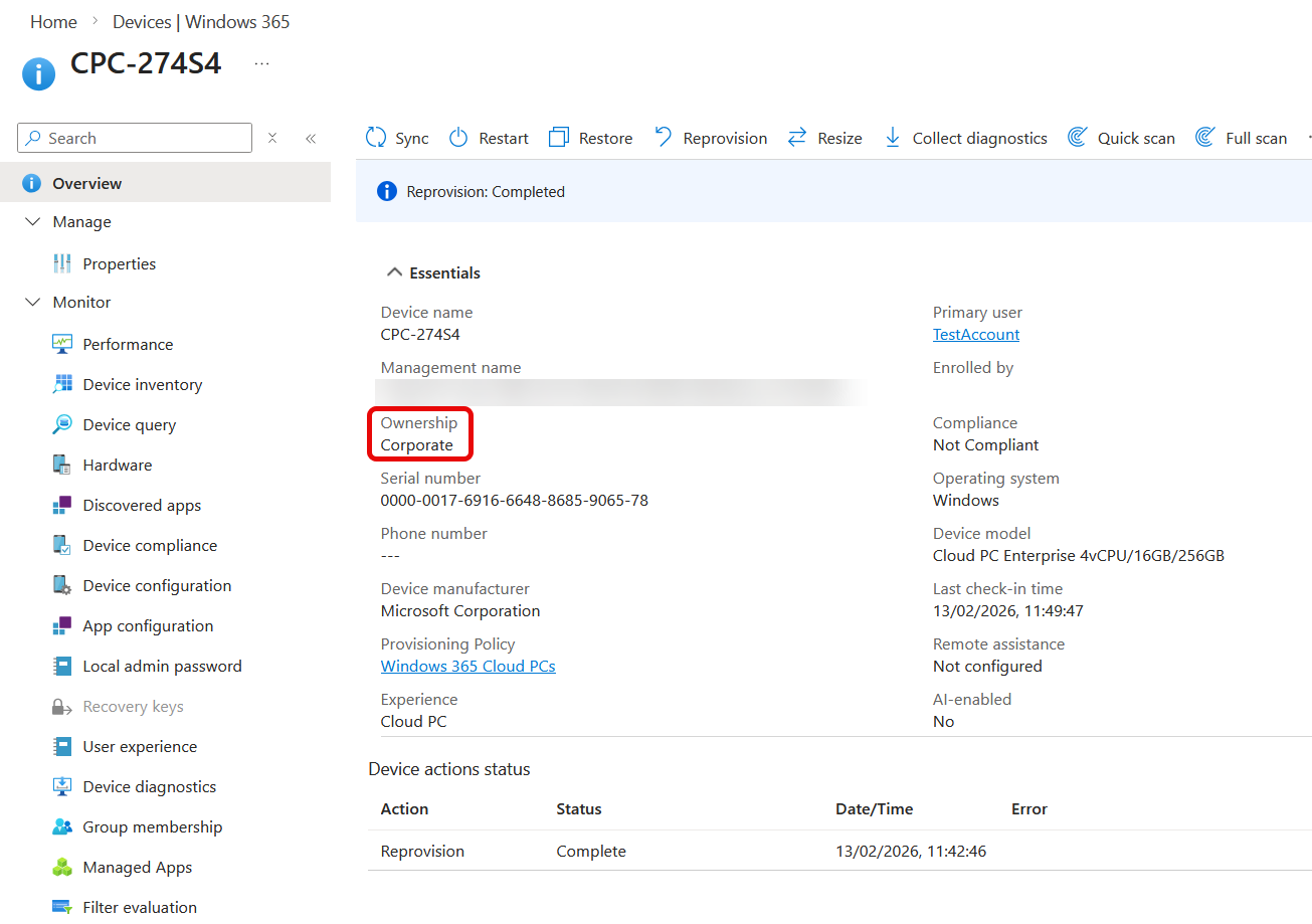 Except this provisioning is successful, and at the end of the provisioning cycle there is a device that is listed as Corporate under ownership: